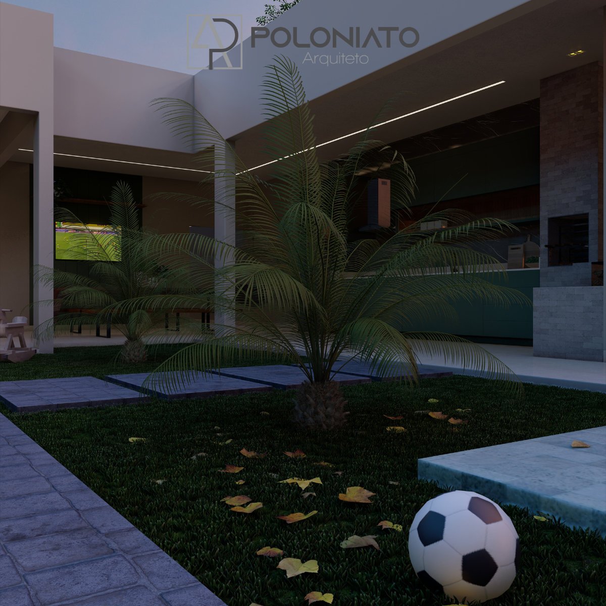 O destaque do projeto é a área gourmet integrada à piscina, que atua como ponto central de convivência. O espaço é cercado por paisagismo tropical leve, com palmeiras e gramado entre os caminhos de acesso, criando uma atmosfera agradável e relaxante.