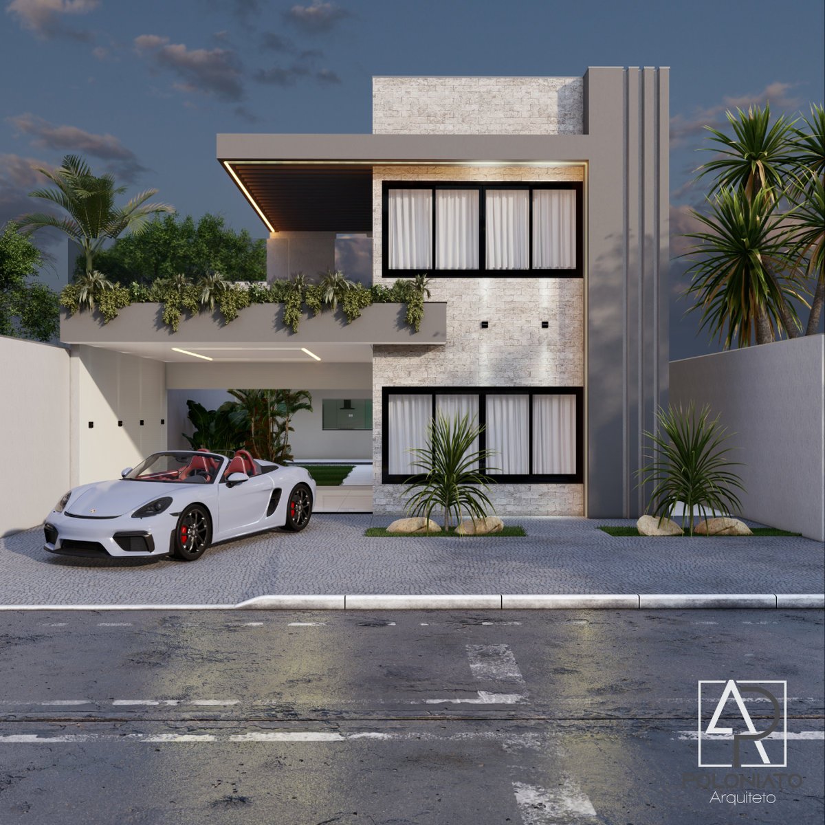 O pergolado com iluminação embutida em LED realça o volume superior e proporciona uma recepção acolhedora. Um detalhe que se destaca é o jardim suspenso, que adiciona frescor e sofisticação à varanda frontal do pavimento superior.
